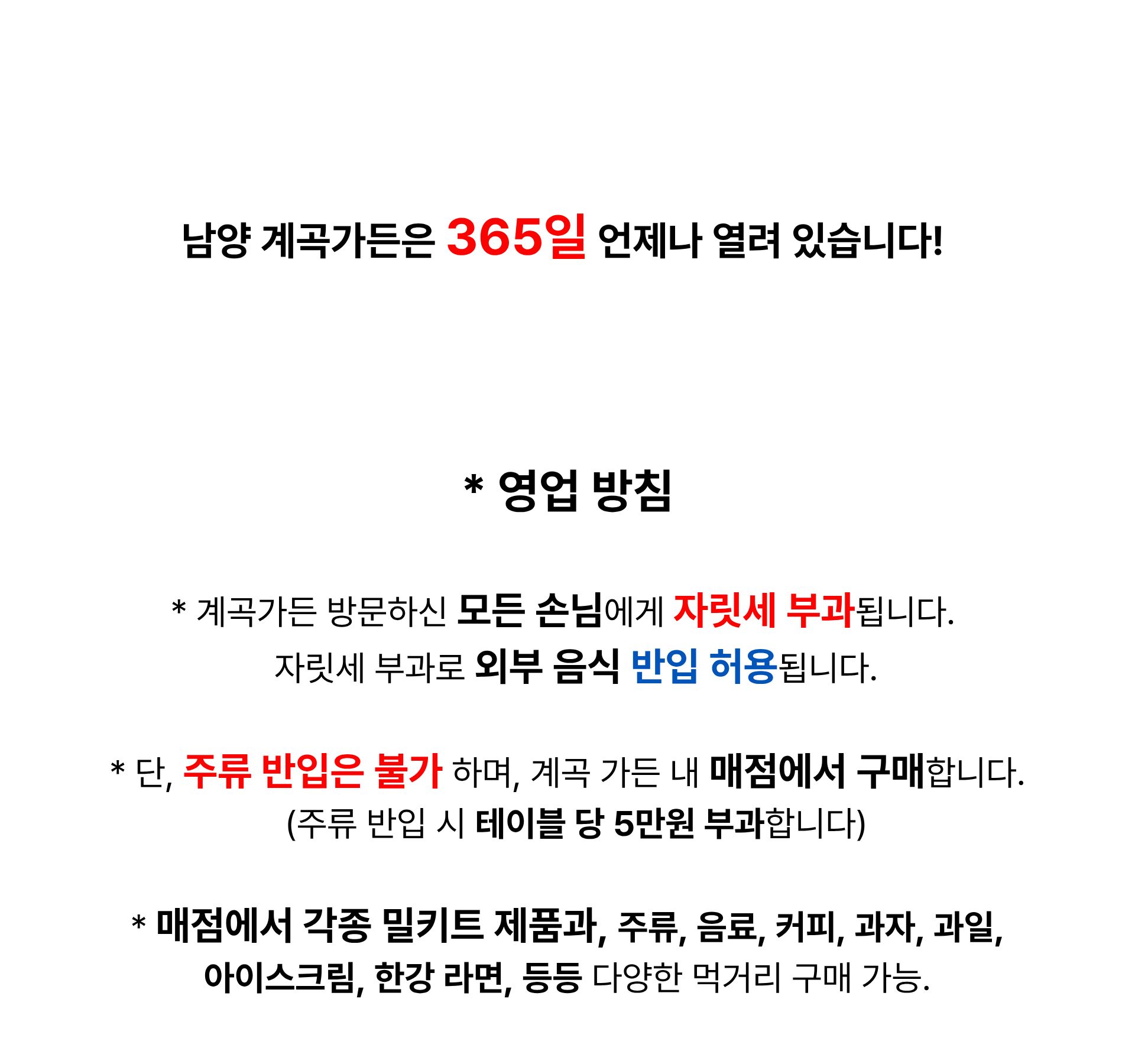 * 단, 주류 반입은 불가 하며, 계곡 가든 내 매점에서 구매합니다.(주류 반입 시 테이블 당 5만원 부과합니다)