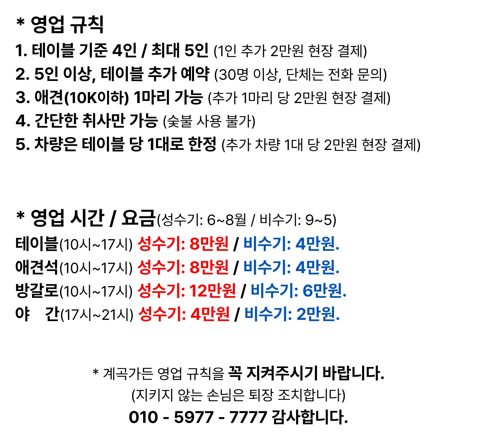 * 성수기: 6~ 8월(요금: 8만원 야간: 4만원) / 비수기: 9~ 5월(요금: 4만원 야간: 2만원)                         * 5인 이상은 추가 테이블 예약해야 합니다. (30명 이상, 단체 전화 문의)