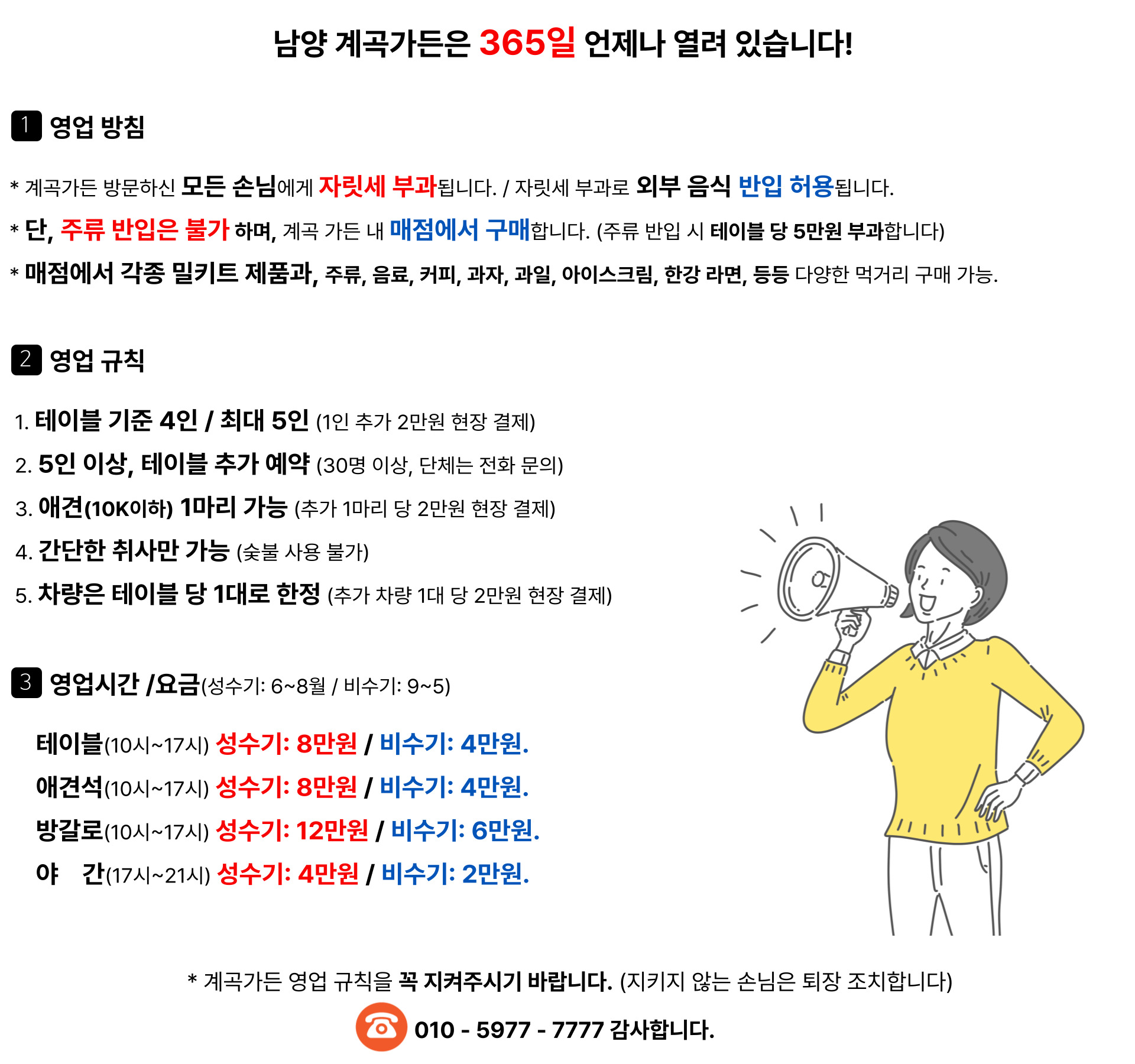 * 계곡가든 방문하신 모든 손님에게 자릿세 부과됩니다. / 자릿세 부과로 외부음식 반입 허용됩니다.