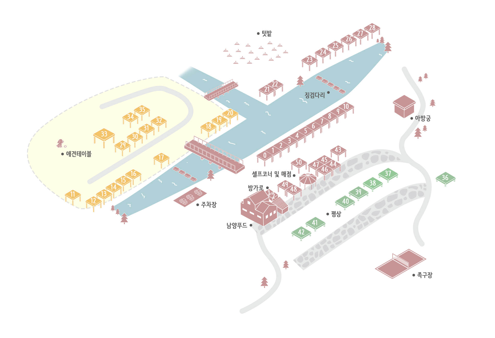 33 34 35 29 30 31 32 11 12 13 14 15 16 17 18 19 20 21 22 23 24 25 26 27 28 주차장 0 1 2 3 4 5 6 7 8 9 10 방가로1 방가로2 49 48 50 47 45 43 46 44 37 38 39 40 41 42 36 아방궁 족구장 남양푸드